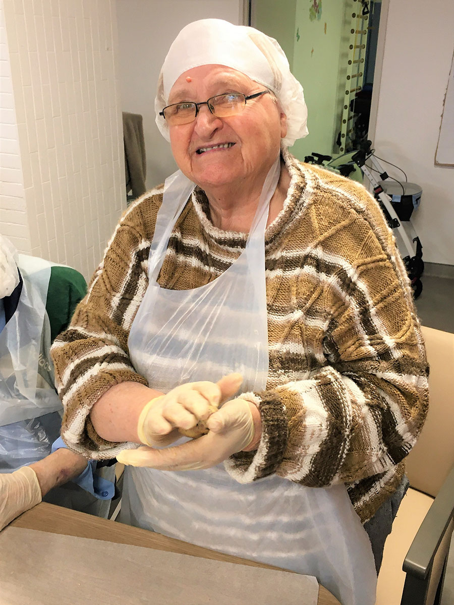 L’atelier cuisine permet aux résidents de pouvoir réaliser des plats « comme à la maison ». Cette activité a pour objectif d’être un temps d’échange et de partage autour des plaisirs de la table. Elle permet aussi de faire travailler la mémoire (se souvenir des recettes) et la motricité des mains et des doigts.